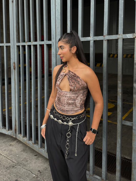 Brown fitted top + Índigo jeans + Furry belt + Accesorios para un sábado de salidita a cenar y tal vez se alarga la noche a un party.