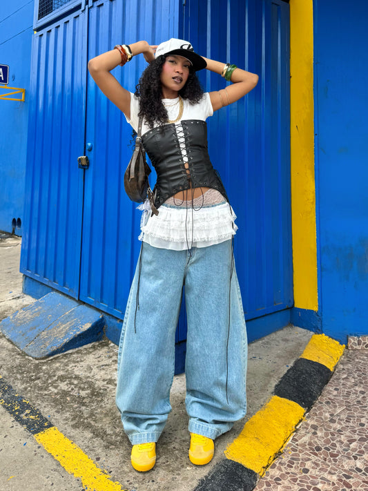 Ver lookBarrel blue jeans aquí Jay usando talla 14/32 y boxy shirt + tank top en talla M.