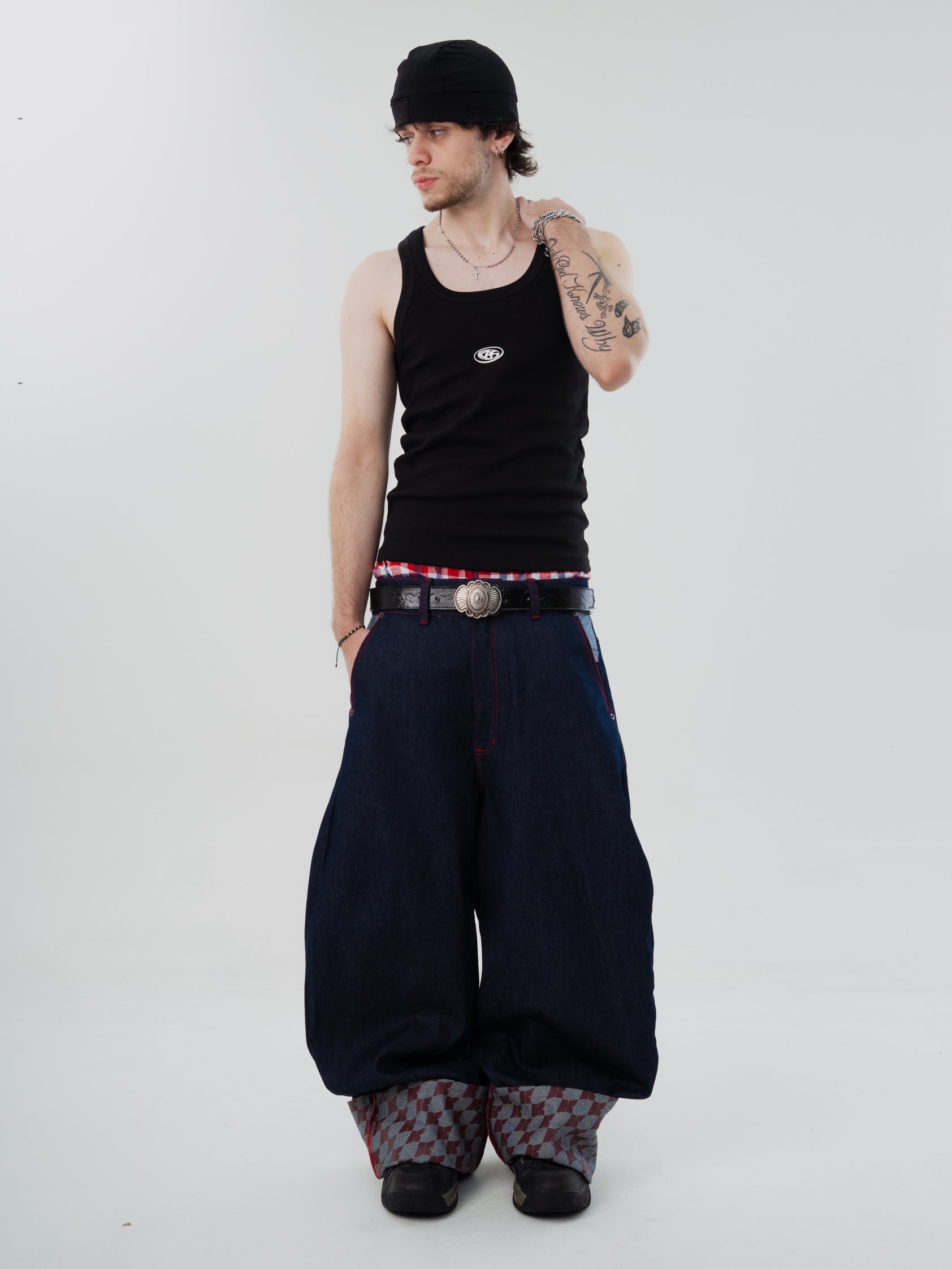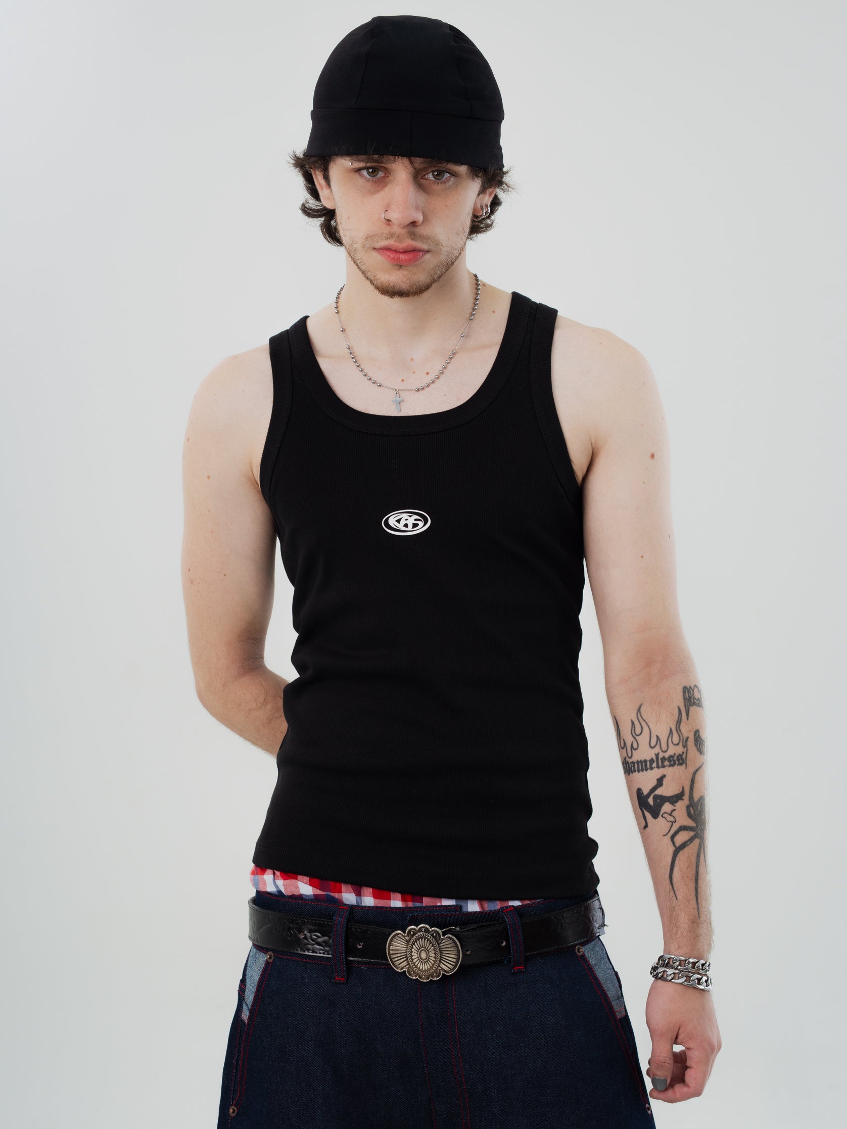 Tank top básico unisex elaborado en rib con logo en vinilo de alta densidad. El modelo está usando talla M.