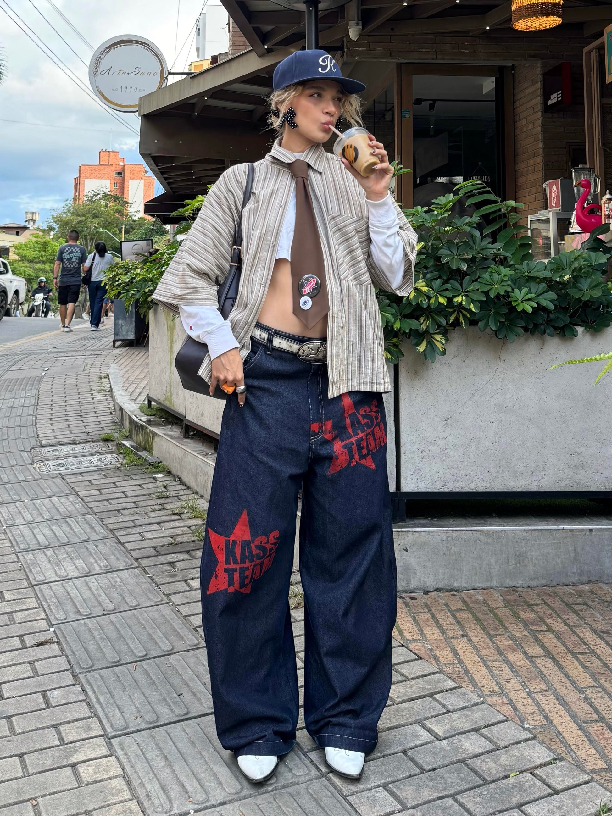 Camisa unisex tejido 100% algodón fit tipo boxy con un bolsillo delantero y corbata incluida. La modelo está usando talla S y el modelo está usando talla M.