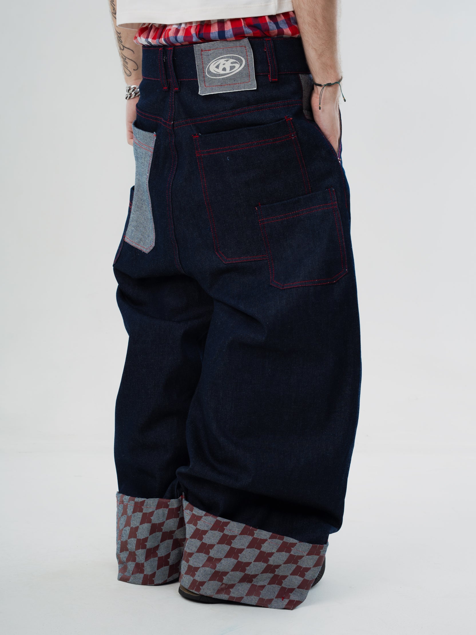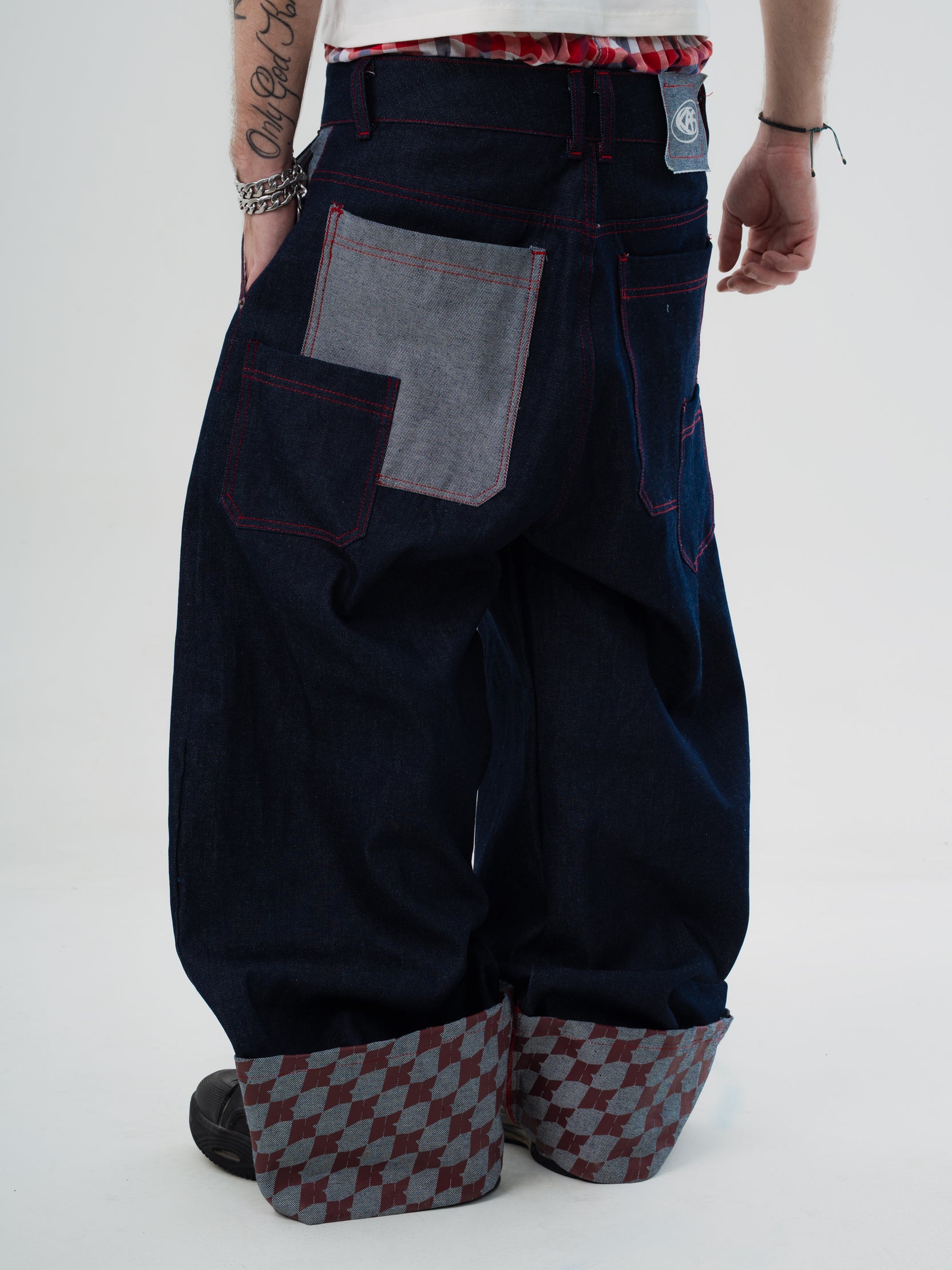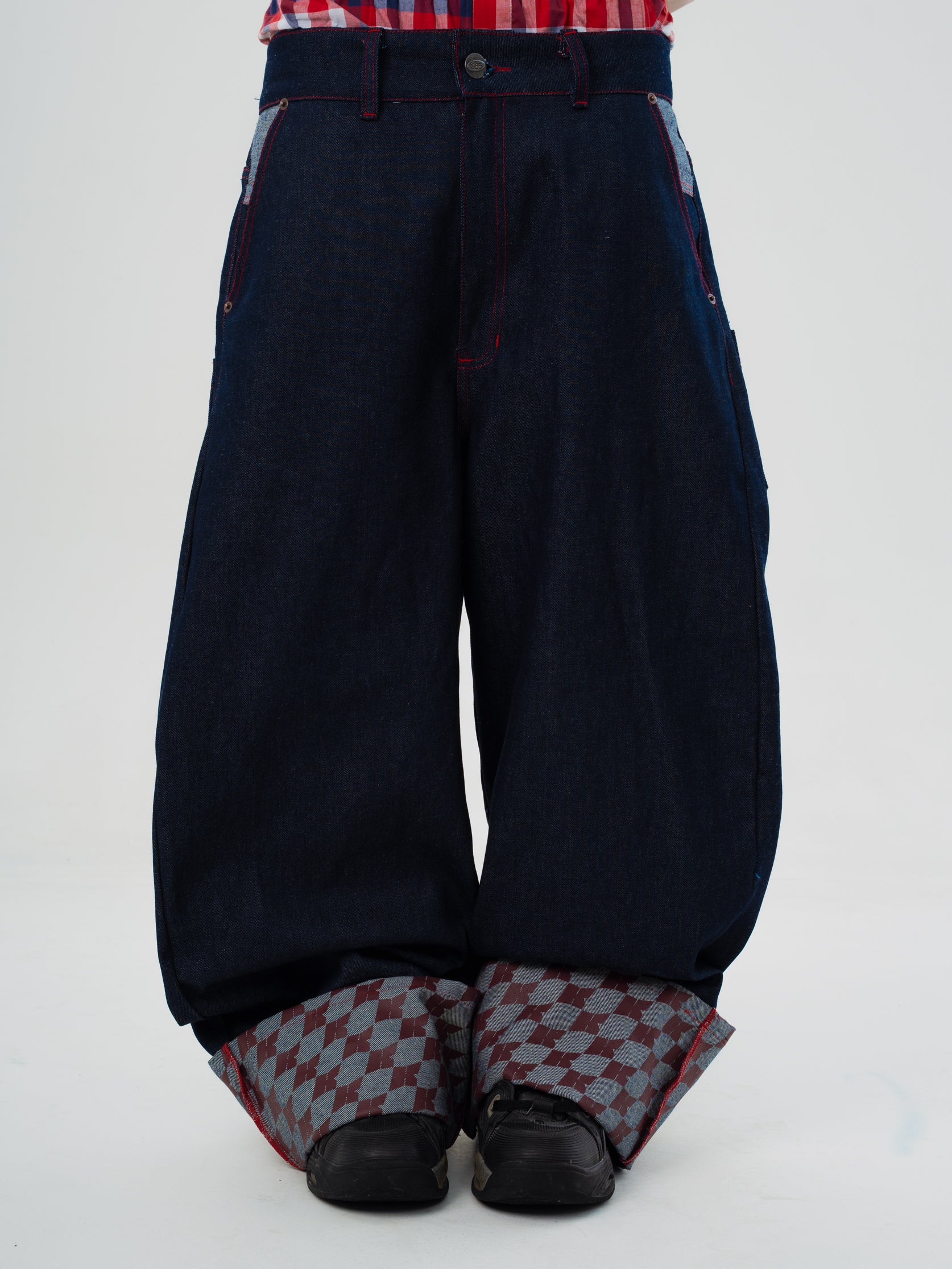 Raw denim rígido con costuras color rojo y botas estampadas en serígrafía. La modelo está usando talla 12.