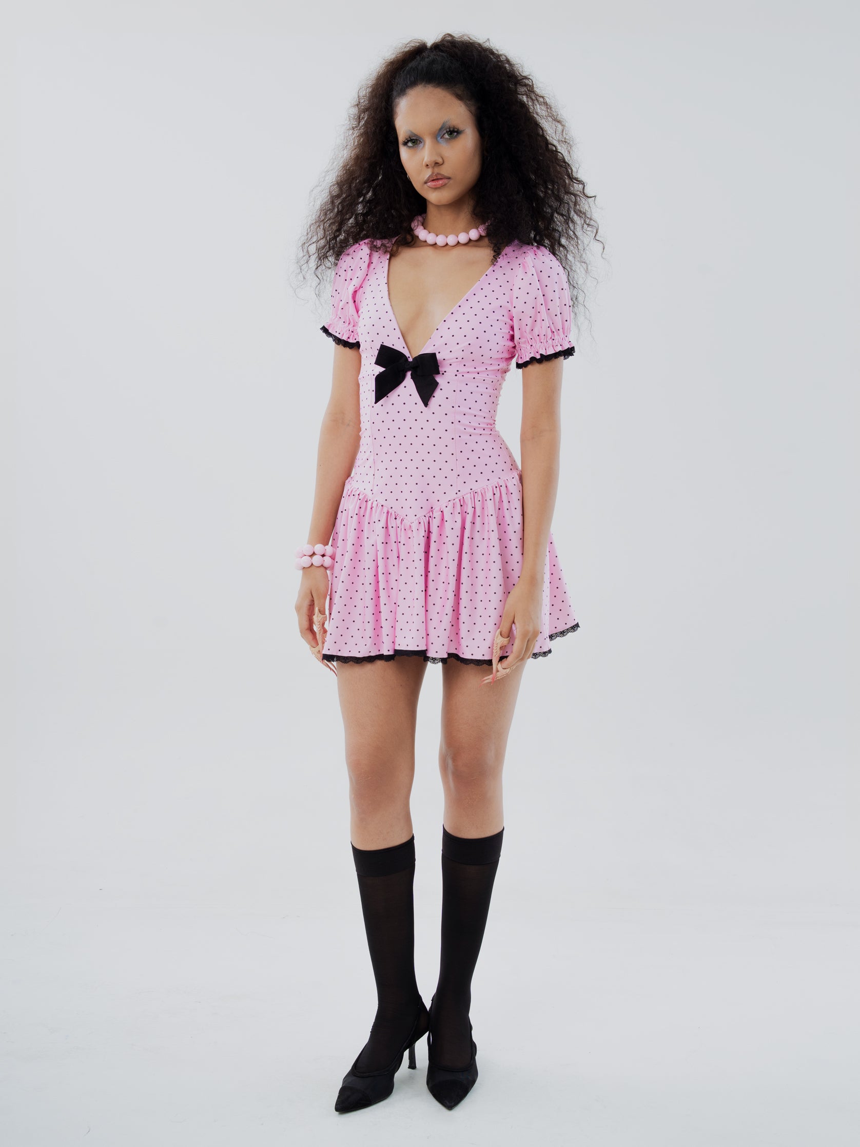 Vestido elaborado en lycra con detalles en encaje y cierre invisible en la parte posterior. La modelo está usando talla S.