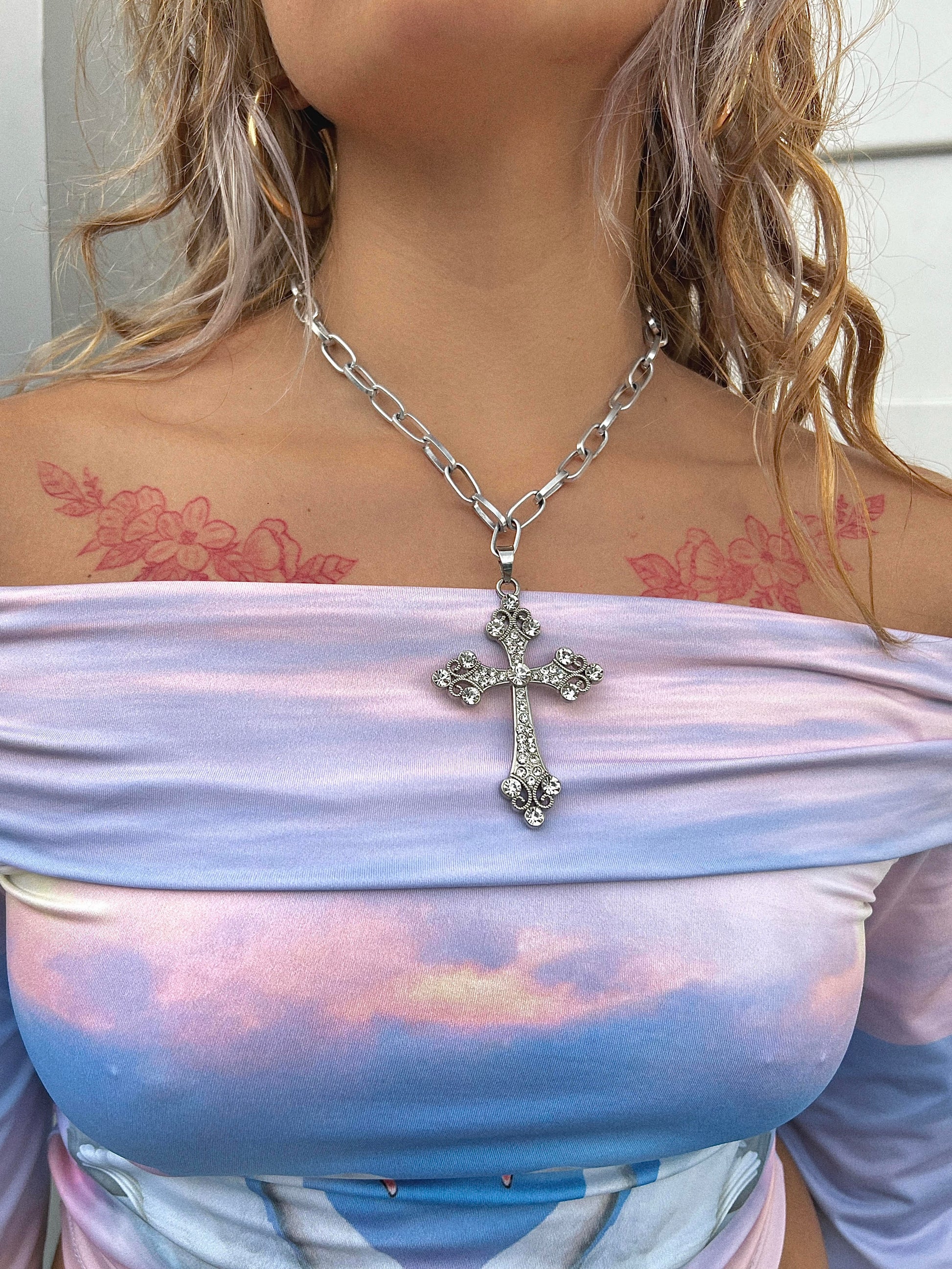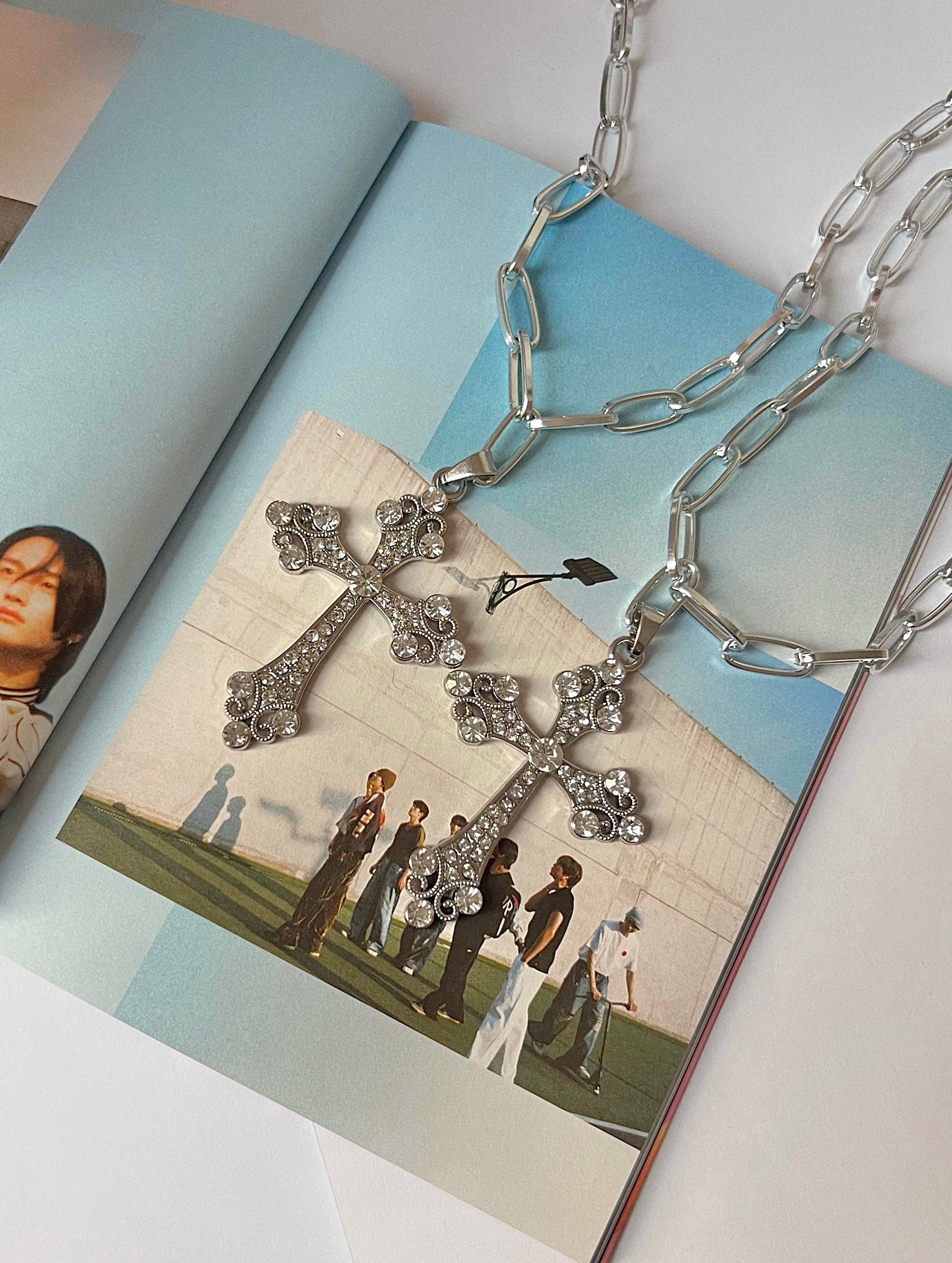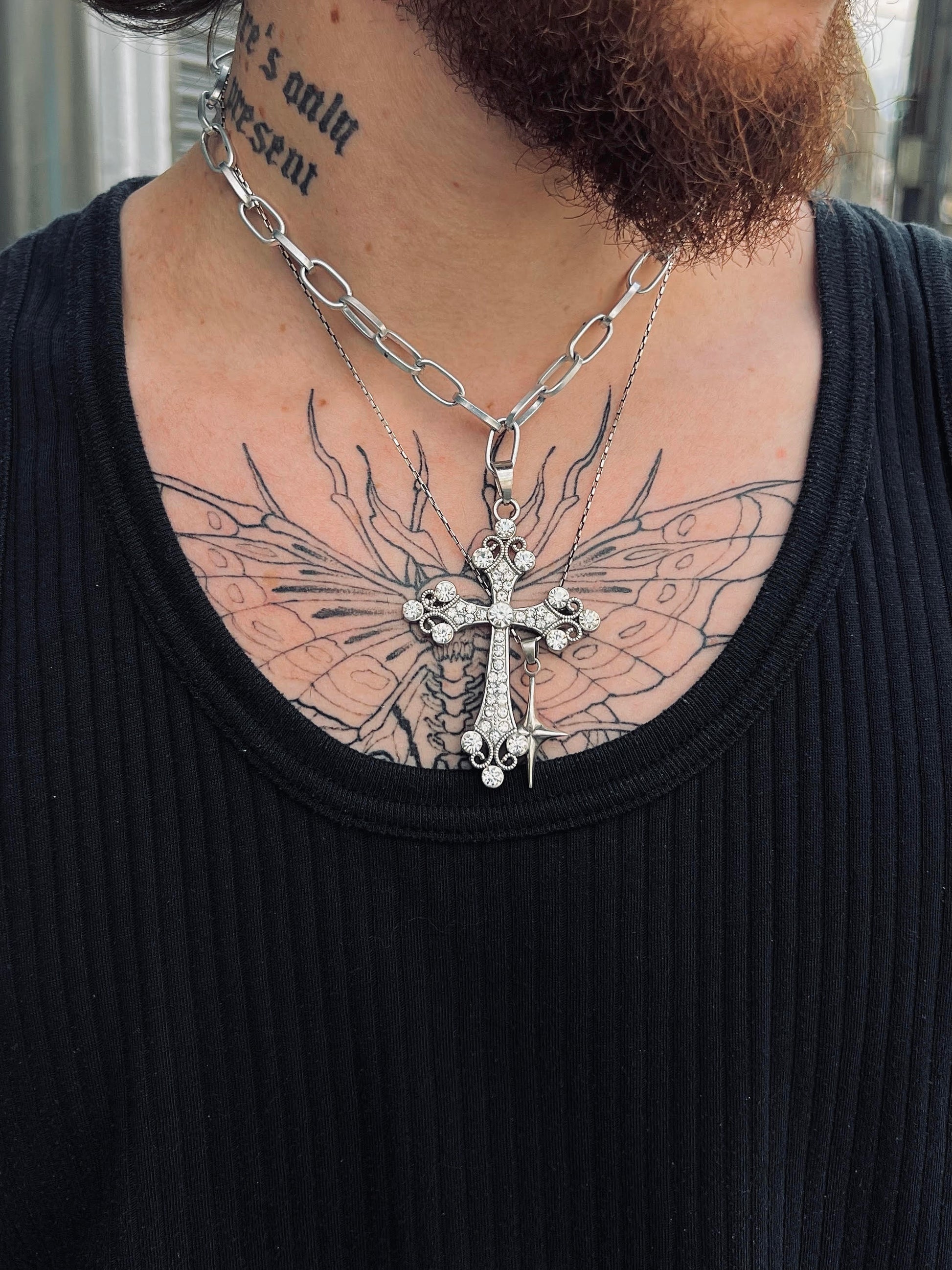 Cadena elaborada en acero inoxidable y cruz en zamak, acabados inoxidables. Mide 65 cm.